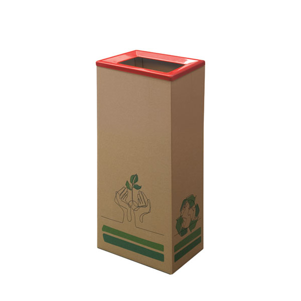 Gettacarte in cartone 100% riciclabile; profili colorati in opzione per incentivare la raccolta differenziata; installazione su piano d’appoggio; in opzione, etichette pre-fustellate in vinile per la differenziata.