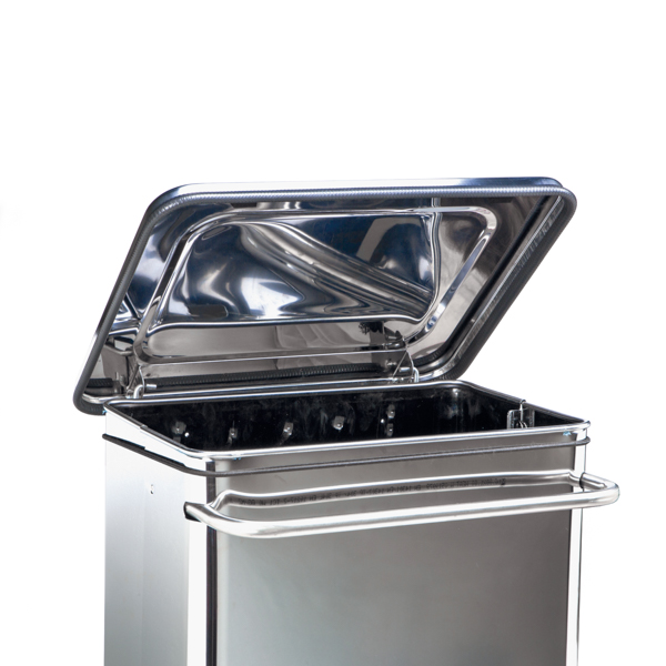 Struttura e coperchio in acciaio inox, con finitura brillante; pedale e maniglia in acciaio inox; frontale asportabile per facilitare il ricambio del sacco; ampio pedale per utilizzo conforme al metodo HACCP; elastico fermasacco; ruote in gomma per un facile spostamento.