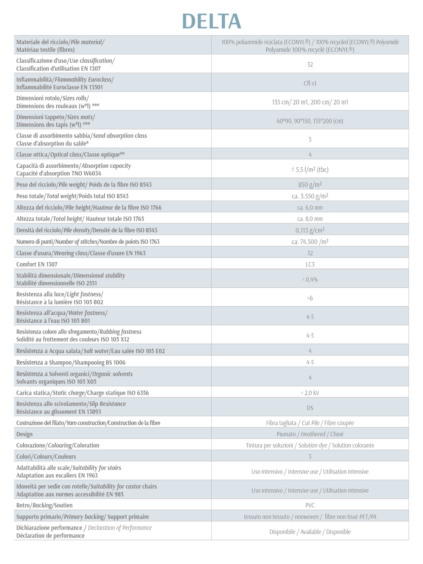 Delta è un tappetino d’ingresso assorbente con una sottile fibra raschiante.  Realizzato in filato ECONYL®, contiene HydroTX™ la tecnologia che consente ai tappeti d’ingresso  di assorbire più velocemente l’umidità e mantenere pulito e asciutto il pavimento interno  sotto al tappeto.