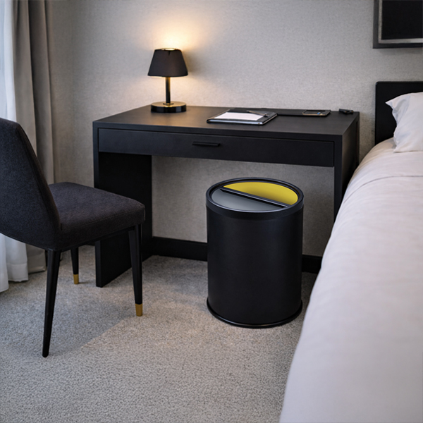 Struttura in metallo verniciato nero; due secchi colorati ed estraibili in polipropilene (6 L + 6 L); ghiera superiore rimovibile; indicato per camere d’albergo, cabine delle navi e uffici; ideale per una differenziata d’interni puntuale e ordinata.