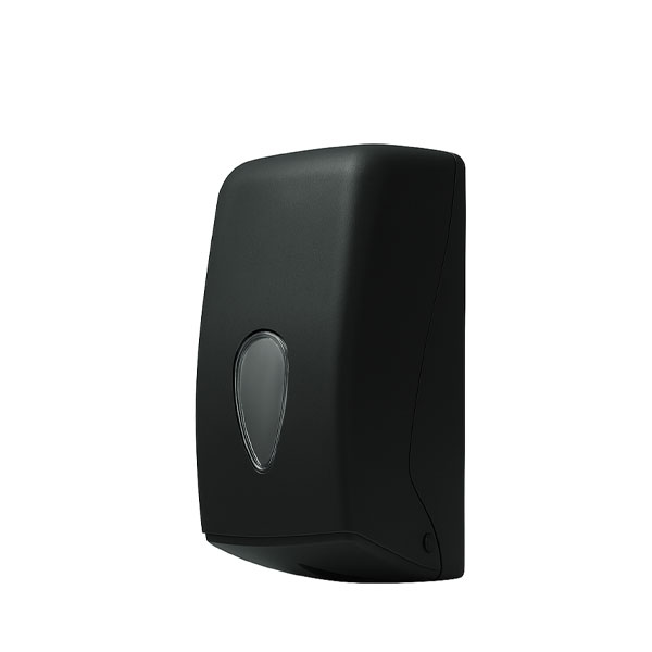 Base e cover in ABS riciclato nero opaco soft touch; visore di controllo in policarbonato; diametro max. rotolo vers. MINI: Ø 120 mm; erogazione dal basso, facile e veloce; design versatile e innovativo; resistente agli urti e agli sbalzi di temperatura; chiusura di sicurezza con chiave; viteria e tasselli inclusi.
