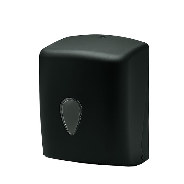 Base e cover in ABS riciclato nero opaco soft touch; visore di controllo in policarbonato; diametro max. rotolo vers. MAXI: Ø 190 mm; erogazione dal basso, facile e veloce; design versatile e innovativo; resistente agli urti e agli sbalzi di temperatura; chiusura di sicurezza con chiave; viteria e tasselli inclusi; visserie fournie.