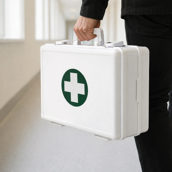 Valigia in polipropilene; maniglia per un facile trasporto; supporto murale incluso; pacco medicazione non incluso.