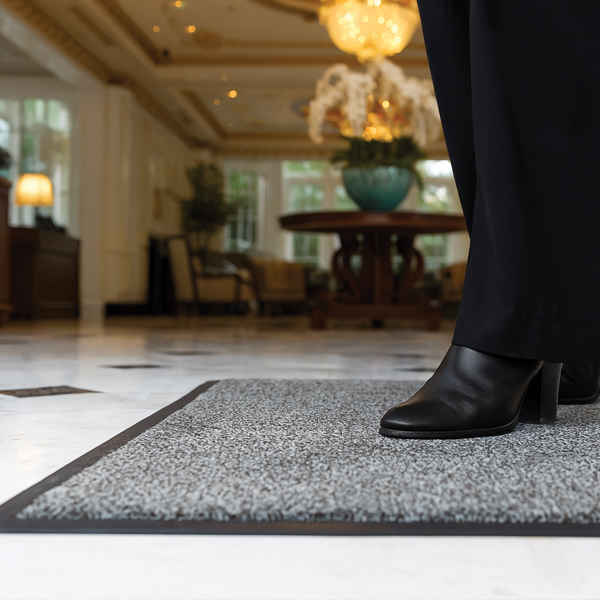 Filato in poliammide rigenerata ECONYL® ad alta resistenza; fibre ritorte e termofissate anti-schiacciamento; controllo statico: ~10¹¹ ohm (ISO 10965) – carica personale <2 kV (ISO 6356); classe di protezione antincendio Cfl-s1; elevata capacità assorbente e ottima rimozione dello sporco; fondo in nitrile 100% lavabile, resistente e antiscivolo; lavabile in lavanderia industriale; fornito in più formati; venduto a metro quadro.