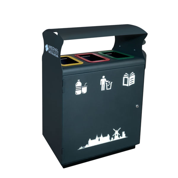 Steel case (sheet steel thickness 2 mm); primer finishing + Polyester powder coating (manganese grey RAL 7021); two front opening streams; coloured frames to encourage waste separation; holds 2 steel wire sack holders (2 x 60 L); tubular 50x50 plinth with provision for ground fixing; lock with triangular key; ideal in public places and urban contexts.