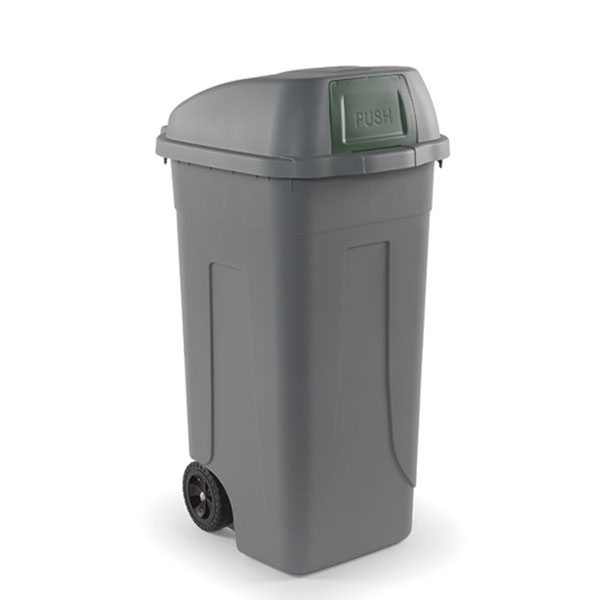 Polypropylene (Plastic Second Life) 100% recyclable; capacity: 100 L; weather and chemical resistant; two wheels and a bell-shaped lid with tilting opening; integrated ergonomic rear carrying handle and 4 fixed bag-holding hooks; ideal for separate collection. \*NO PACKAGING product.
