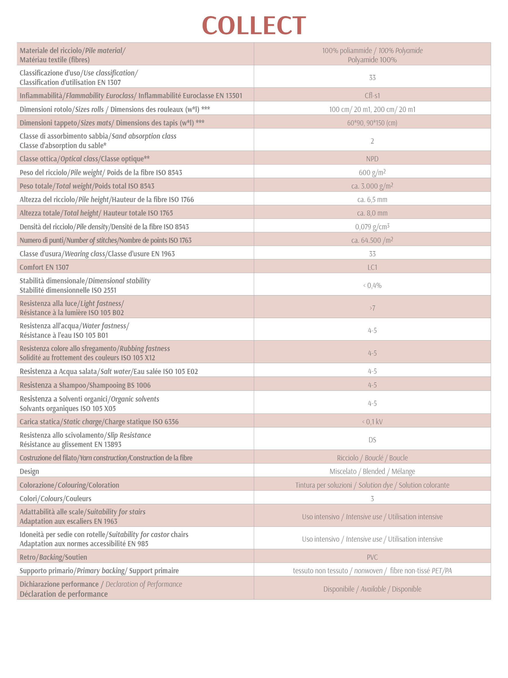 This carpet quality has been conceived for an external use. It is a wonderful supplement for our carpets’ portfolio of products. The mat Collect is made of 100% polyamide yarns, is very strong and has all the features for commercial use. A very fine scraping loop pile takes care of a proper absorption of dirt and moisture, so the functionality is excellent. Available colors red, anthracite and brown.