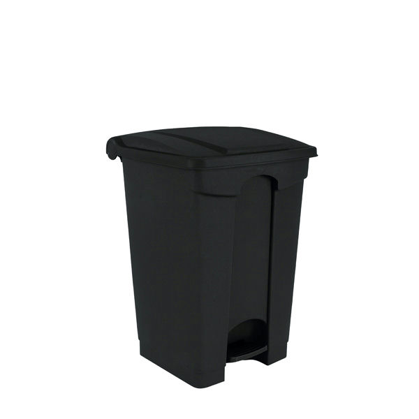 Polypropylène (PP5); aluminum opening mechanism; four lid colors to encourage waste separation; ergonomic handle and wheels for easy maneuvering; large foot pedal for hands-free operation; heavy-duty and easy to clean; sold in 1 pc/box (assembled) or 3 pcs/box (unassembled).