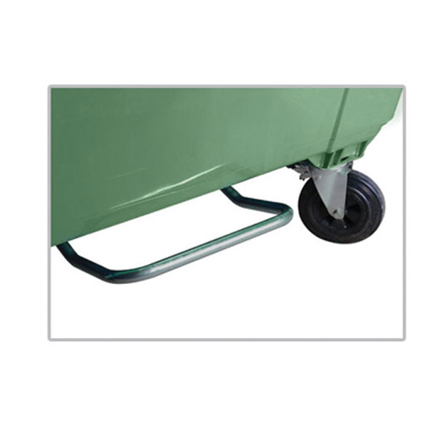 HDPE in an injection moulding process with UV treatment; resistant to temperature changes, shocks, corrosion and chemicals; rubber wheels Ø 200 mm; heavy-duty rubber-tyred wheels, 2 with brake; flat lid with folding opening and lip handle; anti-seepage edge, seat for microchip housing; ergonomic handles for handling ; cap on bottom for proper cleaning and sanitization; manufactured according to DIN 30740 / EN 840