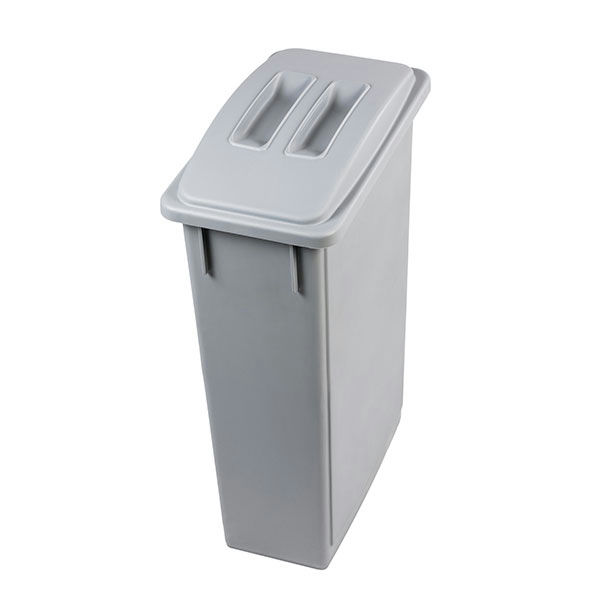 Polypropylene recycled plastic (minimum 70%); plastic opening mechanism; seven lid colors to encourage waste separation; integrated plastic wheels; large foot pedal for hands-free operation; in compliance with the HACCP method.
