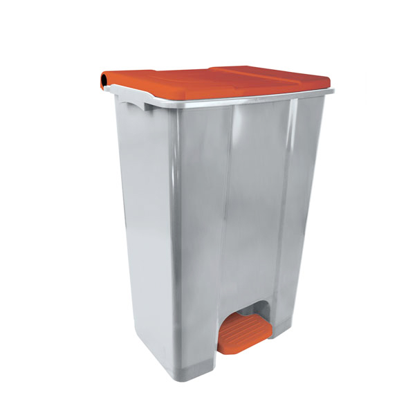 Polypropylene recycled plastic (minimum 70%); plastic opening mechanism; seven lid colors to encourage waste separation; integrated plastic wheels; large foot pedal for hands-free operation; in compliance with the HACCP method.