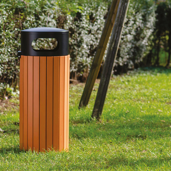 Cold drawn iron plate with electrophoresis treatment; second layer of black powder epoxy coating for outdoor use; surrounding battens in polystyrene (UV and rot proof); inner bucket in galvanized steel with lateral handles; perforated base to allow drainage of rainwater; vandal proof triangular keyed lock system; four ground fixing points; galvanized steel screws included.