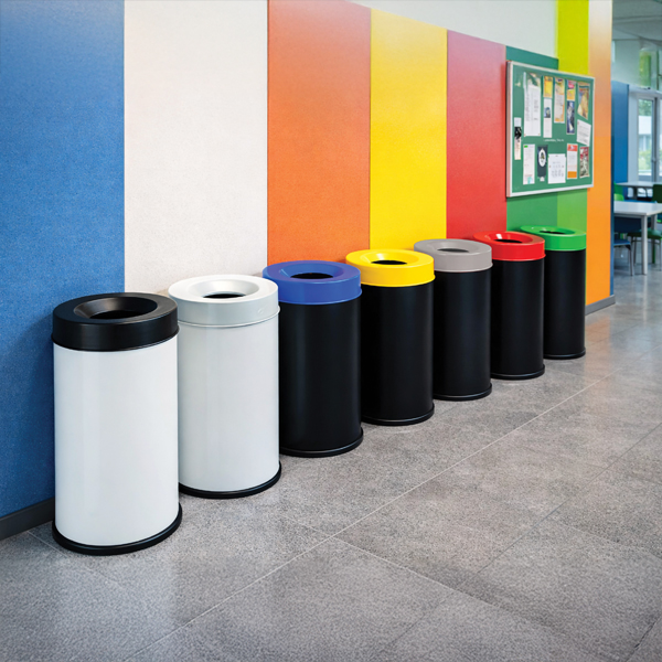 Lid with 100 mm lateral edge; special fire-extinguishing lid prevents fire from spreading; several colour options available to encourage waste sorting; non-scratch rubber base ring; CNPP certified.