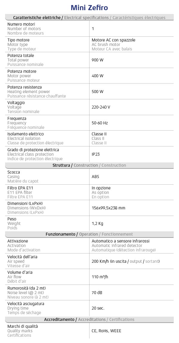 Mini Zefiro is the ideal solution for any small restroom requiring an efficient drying system. Operated by a heater-free 900 W motor, this dryer is even more powerful and cost-effective when compared to larger models in the same segment. A great choice for medium-low washroom environments, Mini Zefiro perfectly dries the hands in just 20 seconds. ENERGY-SAVING - Designed with super speedy technology in mind, Mini Zefiro is operated by a powerful 400 AC motor, incorporating a 500 W heating element. This massively lowers the energy consumption. INSTANT WARM AIR - To offer a greater comfort in use, the dryer incorporates a heater that instantly warms the air during hand drying operations. ULTRA-COMPACT DESIGN - Its ultra-compact shape, only 10 cm depth, makes this product the smallest smart dryer available on the market. Nevertheless, the wide cone nozzle design spreads airflow across a large area, ensuring both hands are dried at the same time. AUTOMATIC ACTIVATION - The dryer is equipped with an effective infrared sensor which detects the hands placed below the dryer, thereby activating a 200 km/h air stream. EPA FILTER (AS OPTION) - Mini Zefiro may incorporate a replaceable EPA E11 filter, which purifies the air by trapping up to 97,66% of dust microparticles, pollen and bacteria suspended in the incoming air flow.