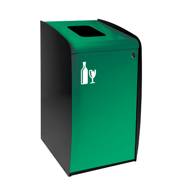 Housing and lid from powder-coated steel; “Door” version: opening by frontal door; galvanised steel wire inner heel holder; lock with triangular key; opening by upper door; ideal to create recycling stands; 4 height-adjustable feet; four wheels Ø 40 mm as option (2 wheels with break); as option, PVC stickers for waste sorting.