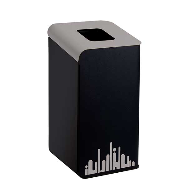 Housing and lid from powder-coated steel; coloured lids to encourage waste separation; pre-applied colored “skyline” stickers; inner sack holder; opening by upper door; ideal to create recycling stands; 4 height-adjustable feet; as option, four wheels Ø 40 mm as option (2 wheels with break); as option, PVC pre-cut adhesive labels for waste sorting.