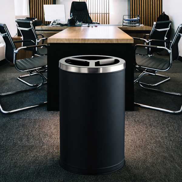 Three inner buckets in galvanized steel or coated steel; bucket capacity: 35 L (tot. 105 L); waste separation stickers not included; plastic bottom ring; ideal in medium traffic areas.