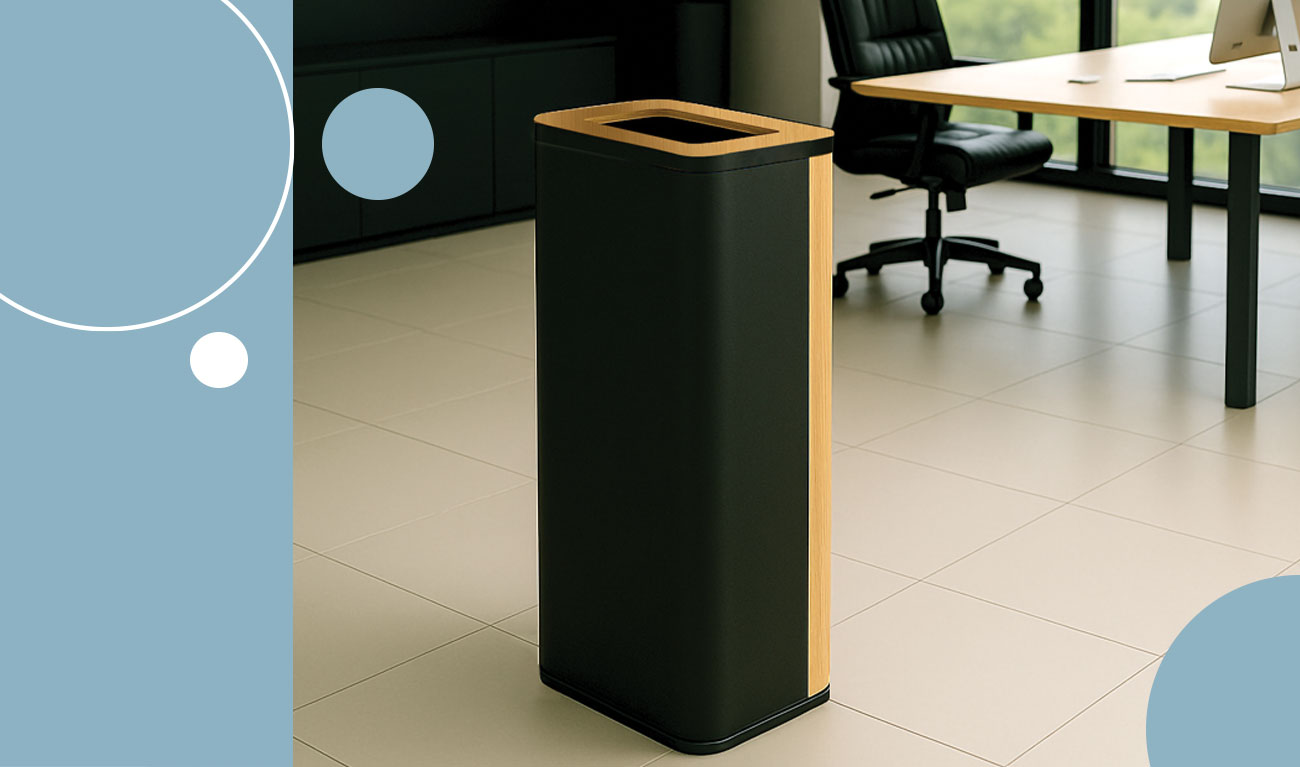 In a world where design meets functionality, JUBLO stands out as a discreet yet refined piece of décor. Made from matte black metal with 3M DI-NOC™ wood-effect adhesive accents, this bin blends structure and warmth in a perfect balance of materials. The contrast creates the “mix and match” effect for an elegant interior design, making it ideal for prestigious spaces such as hotel lobbies, executive offices, and reception areas.