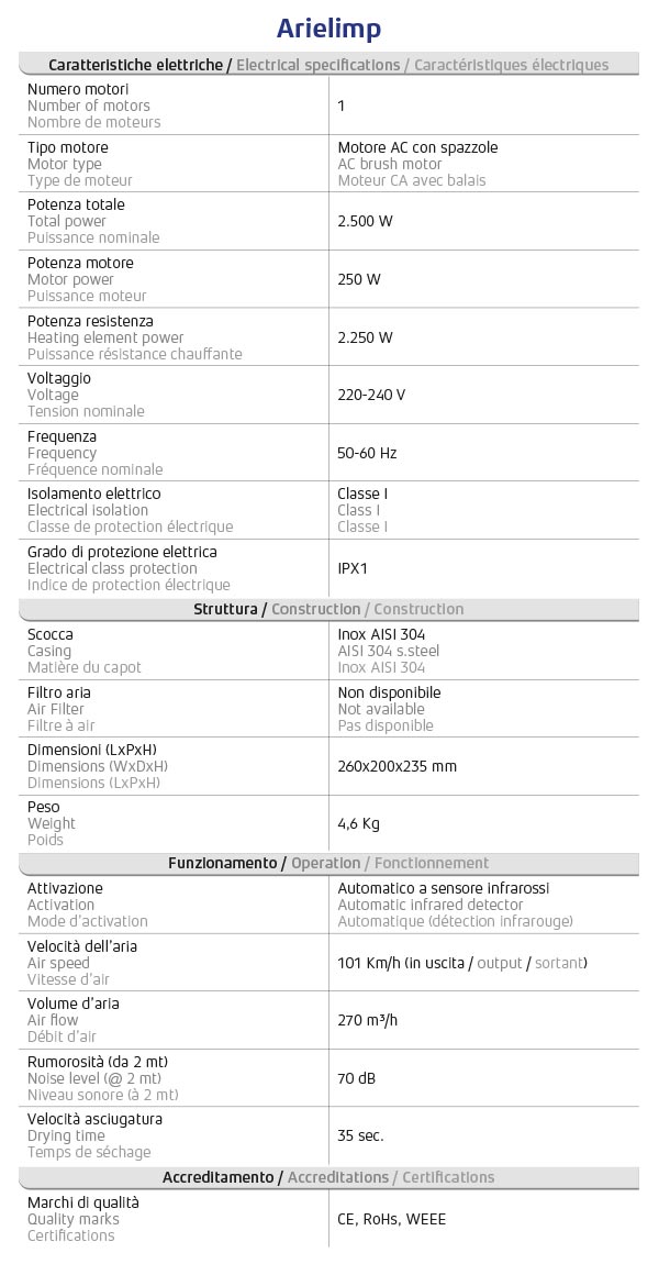 Arielimp est une sèche-mains traditionnelle à air chaud dotée d’un corps robuste en acier inoxydable résistant au vandalisme. Solution optimale dans des contextes de trafic moyen, ce séchoir est actionné par un capteur, délivrant un jet d’air chaud abondant qui traverse une large union pivotante à 360 °. \n \nSECHAGE CONFORTABLE - Arielimp propose un style de séchage conventionnel. La buse d’alimentation est large et facilement accessible à tout utilisateur, y compris aux personnes âgées ou à mobilité réduite. \n \nAIR CHAUD INSTANTANÉ - Arielimp est équipé d’une résistance chauffante qui permet l’émission instantanée d’un flux agréable d’air chaud et améliore le confort pendant la saison hivernale. \n \nALLUMAGE AUTOMATIQUE - Le fonctionnement est optimisé par un système d’allumage automatique, contrôlé par un capteur photoélectrique. L’activation sans contact empêche l’utilisateur de toucher le séchoir, garantissant ainsi des normes d’hygiène élevées. \n \nANTIVANDALISME - Les capots en acier conviennent parfaitement aux environnements exposés au vandalisme, car ils sont conçus pour résister aux tentatives de vol et de manipulation. \n \nBUSE 360° - Arielimp dispose d’une buse pivotante à 360 °, qui vous permet de vous sécher les mains, le visage et les vêtements de manière pratique et sûre. Une solution idéale dans les centres de loisirs et les restaurants d’autoroute.