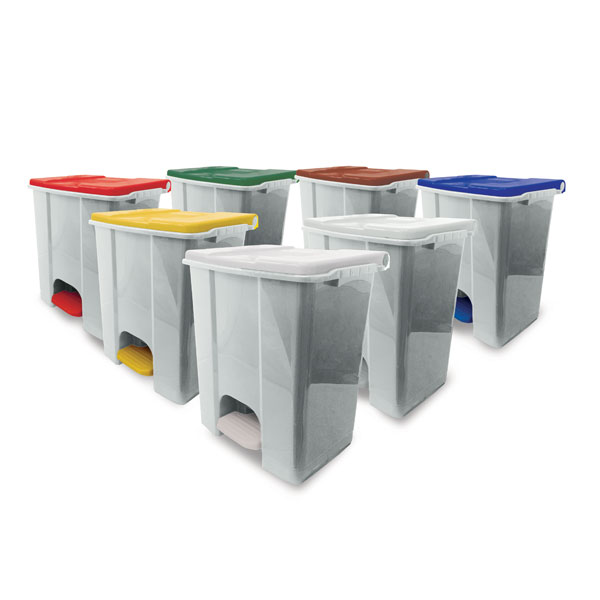 Polypropylène plastique recyclé (minimum 70%); barre d’actionnement du couvercle en plastique; couvercles colorés pour faciliter le tri sélectif; roues en plastique rigide; conforme à la méthode HACCP.