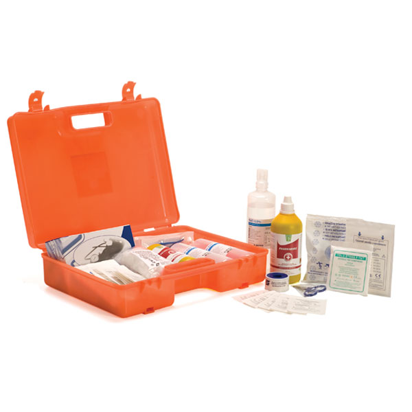 Mallette de transport avec poignée de transport, fermeture à clip et fixation murale intégrée à deux trous comprenant un kit de fixation 2 chevilles +2 vis à crochet court. Le contenu est conforme à l'ensemble. 1 du D.lgs. 81/2008-D.M.388/2003, Les dispositifs contenus dans le kit sont conformes à la CE 93/42 et au DL 24.2.97.Classification : pour les sociétés du groupe AB (3 travailleurs ou plus) 1 copie du décret min. 388 du 15.07.20035 paires de gants stériles jetables1 écran facial1 litre de solution cutanée d'iodopovidone à 10% PMC1500 ml de solution physiologique (chlorure de sodium - 0,9%)10 comprimés de gaze stérile 10X20 dans des enveloppes individuelles2 comprimés de gaze stérile 18x40 dans des enveloppes individuelles2 serviettes jetables cm 40x 602 pinces à pansement stériles jetables1 paquet de filet élastique de taille moyennecoton2 paquets de plâtres de différentes tailles prêts à l'emploi2 rouleaux de plâtre de 2,5 cm de haut1 paire de ciseaux3 tourniquets2 blocs de glace prêts à l'emploi2 sacs jetables pour la collecte des déchets médicaux1 thermomètre clinique numérique1 appareil de mesure de la pression artérielleun manuel d'instructions sur l'utilisation des appareils susmentionnés et sur la manière d'apporter les premiers secours en attendant le service d'urgence