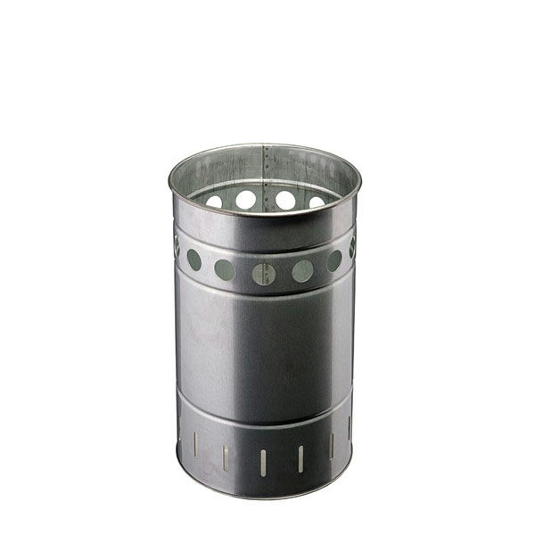 Acier avec base primer galvanisée + vernis polyester coloré; base perforée pour installation au sol (obligatoire); deux options : avec trois ou quatre conteneurs (35 L chacun); auvents, sécurisés par un couvercle ou un cendrier (en option REF. 789409); composition de couleurs personnalisable; serrure à clé triangulaire.