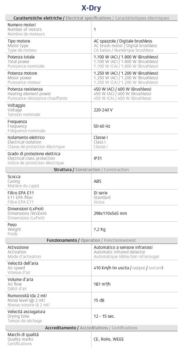 X-Dry offre un nouveau concept de séchage pour les toilettes fort fréquentées. Disponible dans la version avec moteur à courant alternatif ou moteur numérique (brushless), il exploite le principe de séchage à propulsion des séchoirs à jet, élément fonctionnel chauffant le flux d’air instantanément. \n \nMOTEUR AC ou SANS BALAI - La version standard comprend un moteur CA, qui garantit le meilleur rapport qualité/prix. La version “Pro” comprend un moteur brushless, qui offre d’excellentes rendements et moins d’usure dans le temps. \n \nRÉSISTANCE CHAUFFANTE REGLABLE - La température de l’air peut être réglée manuellement grâce à un bouton ON/OFF. Cela vous permet de réaliser des économies pendant la saison estivale et d’améliorer le confort de séchage pendant l’hiver. \n \nPROTECTION THERMIQUE - X-Dry est equipé avec un dispositif qui coupe l’élément chauffant quand la temperature est supérieur à 30°. Très utile suivant les saisons. \n \nBAC RÉCUPÉRATEUR D’EAU - Le sèche-mains est équipé d’un réservoir de récupération d’eau. Cet élément est amovible pour faciliter le nettoyage et prévenir la formation de mauvaises odeurs. \n \nDOUBLE FILTRE EPA E11 (INCLUS) - X-Dry comprend un double fltre EPA E11, qui assure une protection de 97,66% contre les bactéries contenues dans l’air utilisé pendant le séchage.